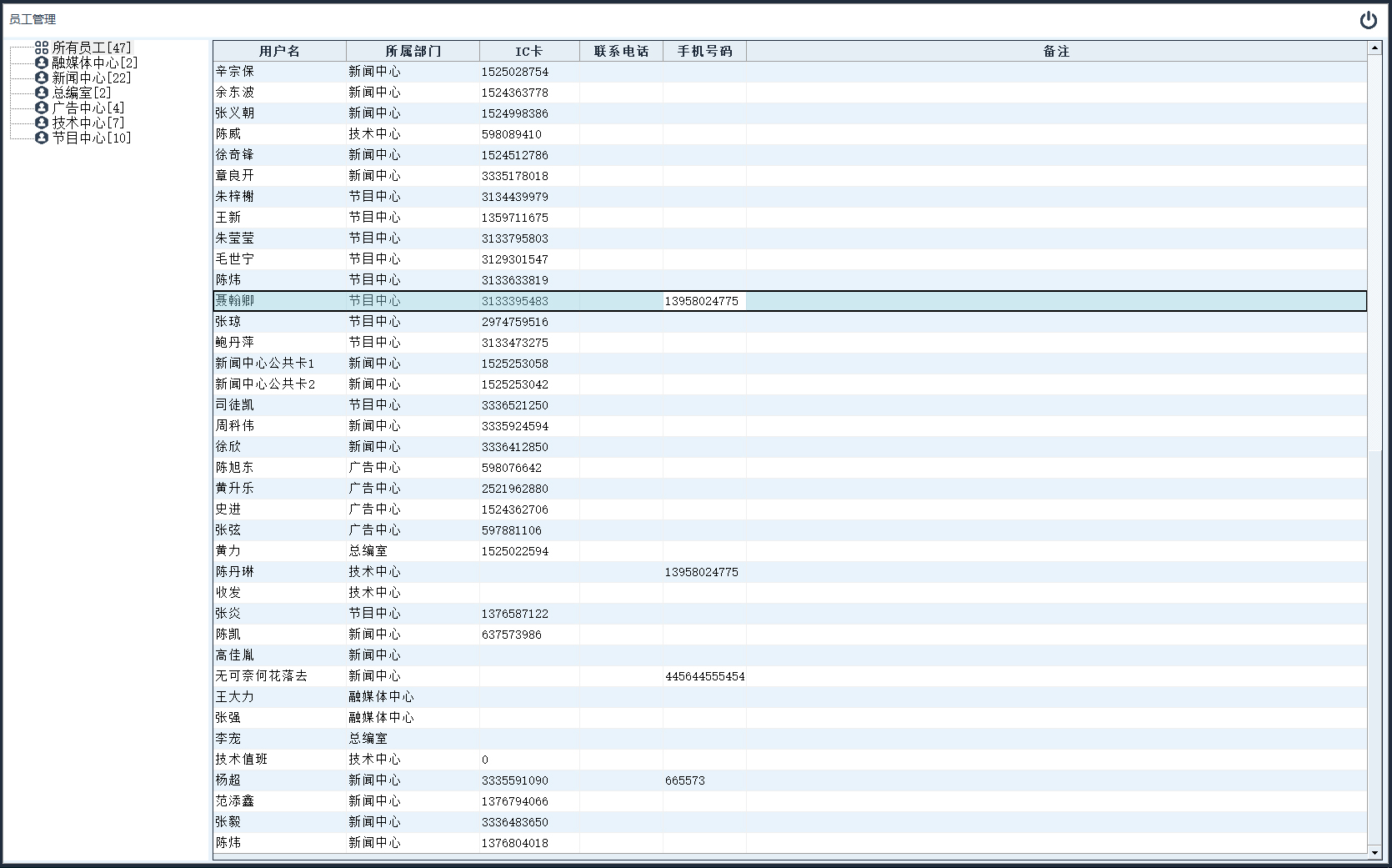 显示员工列表:在左侧组织结构树型目录上双击部门名称,系统将显示该部门下属员工信息。如要显示所有员工则双击“所有员工”项。