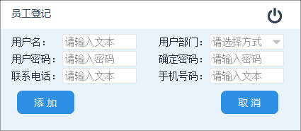随后系统弹出员工登记信息输入框,输入参数后点击“添加”按钮完成操作。