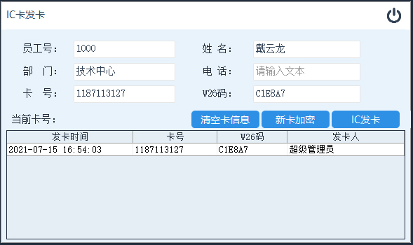 IC发卡:将用户信息写入到IC卡内。发卡成功后此卡可用于登陆软件,领用、归还设备等操作。