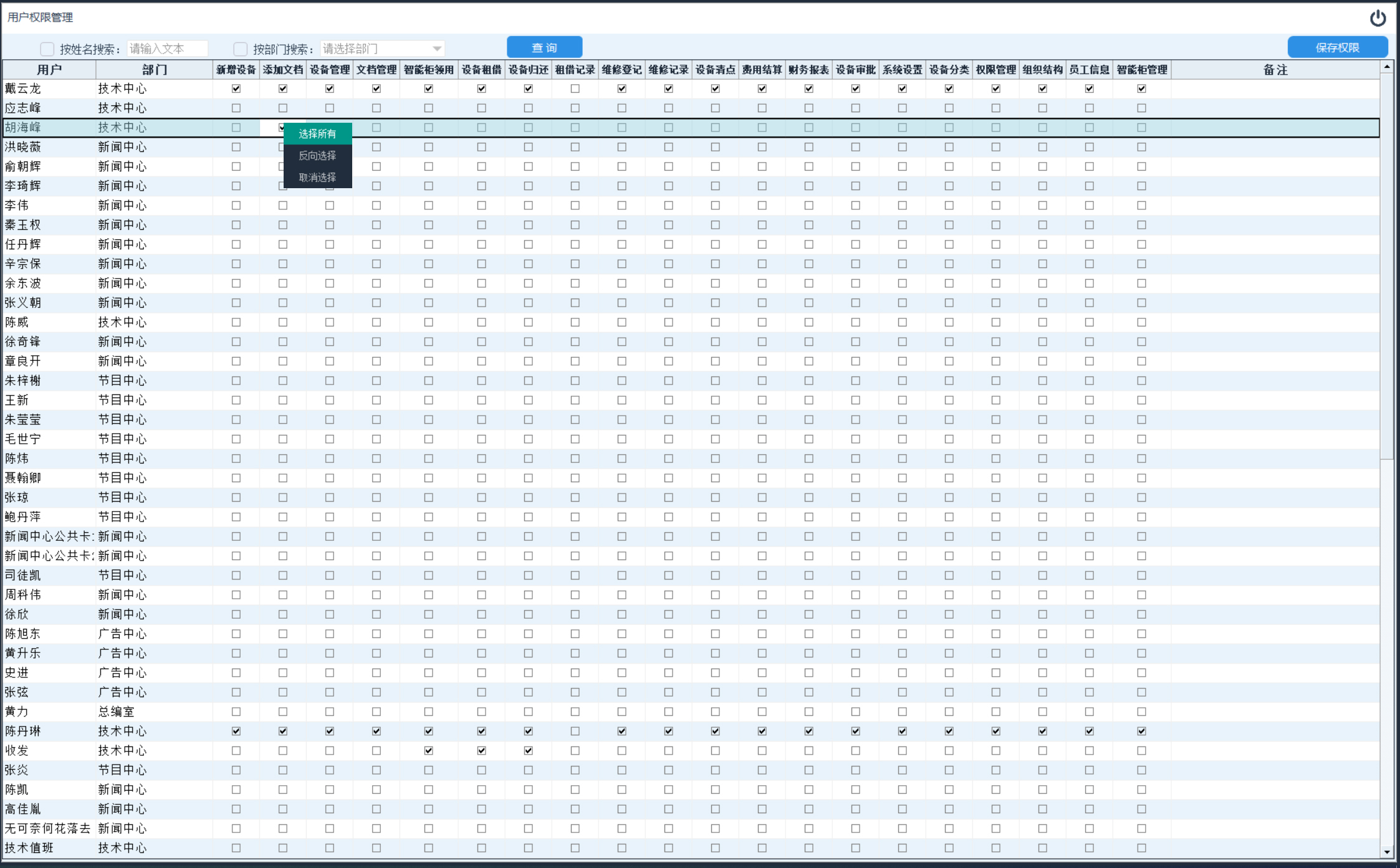 修改权限:当搜索用户结束后,系统会在每个用户名称后面加上所有功能的选择框。如果要赋于某个用户某模块的操作权限,只需在列表区域勾选用户名称与模块名称交集处的选项框即可。所有操作完成后点击“保存权限”完成操作。