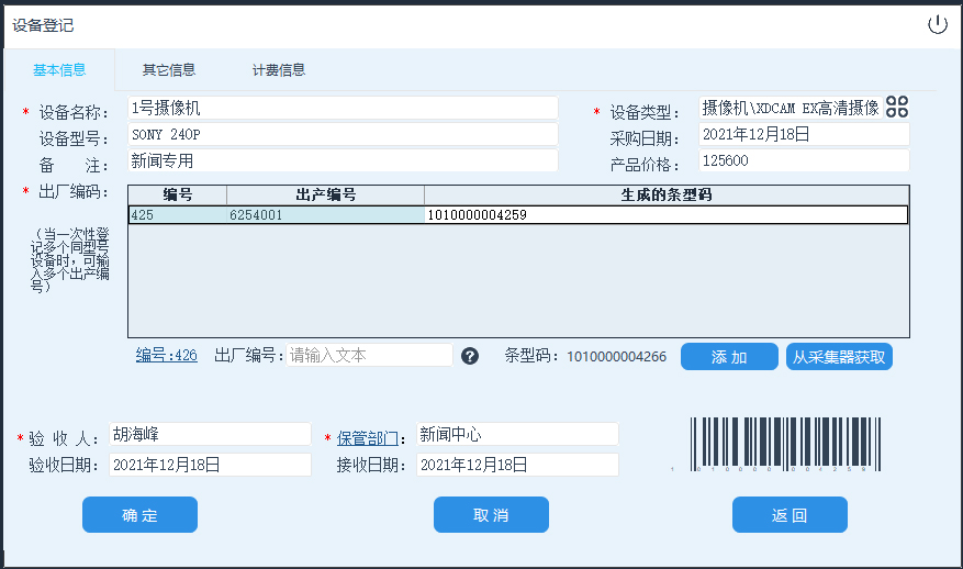点击出厂编号后面的白框,可用扫描枪直接扫描设备原厂条型码。也可人工输入,如设备未提供条型码,可直接双击编号后面的数字,由系统生成一个。