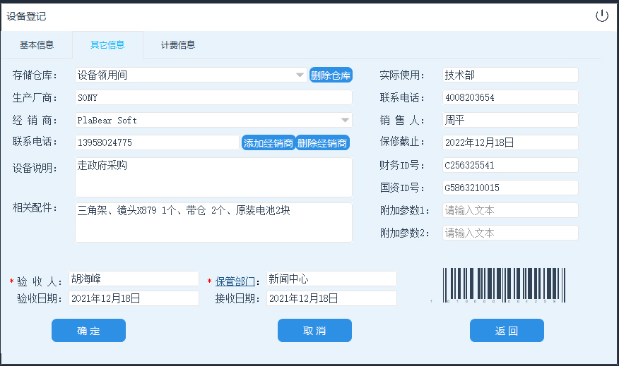 当所有设备参数填写完成之后(除带*号参数外,其它参数可留空),点击窗口左下方“确定”按钮,完成登记操作。如需要可在本次登记操作完成之后直接登记下一设备。