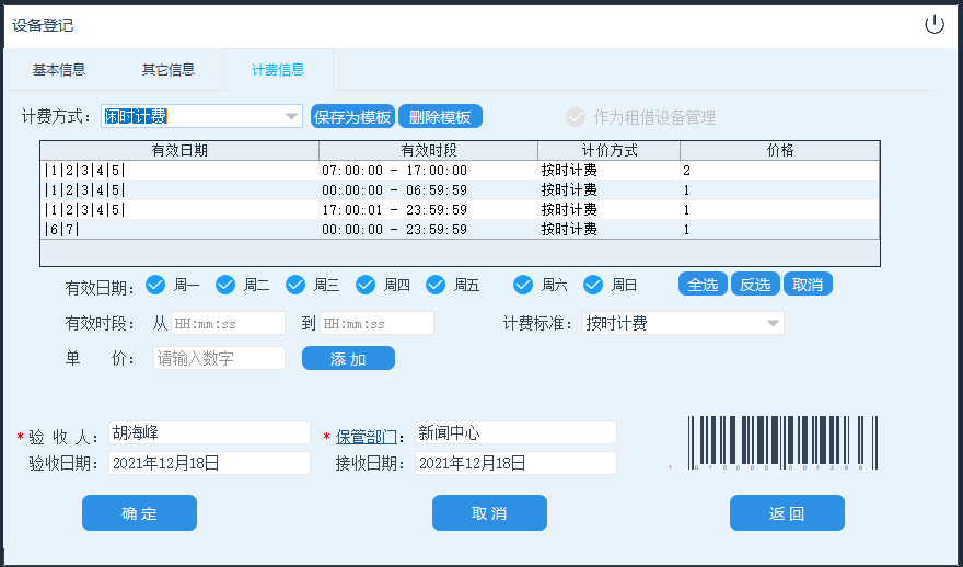设备租借所使用的计费方式。系统提供了设备使用的虚拟计费功能,可按用户的使用时间分时段按不同价格计算费用。虚拟计费为可选功能,如无此功能需求则无需理会。