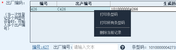 打印条码:出厂编码输入后,可直接选择编码后点击鼠标右键,并在随后的菜单项中选择“打印条型码”打印本设备的系统条码,也可选择“打印所有条型码”打印列表框中所有设备的条码。