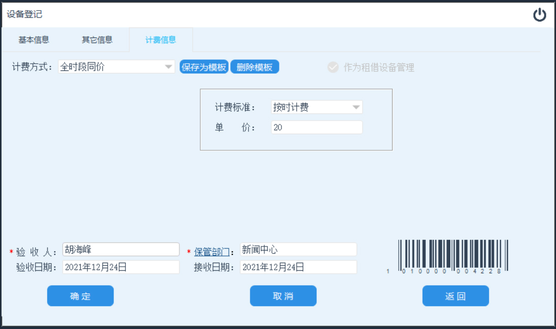 登记新的设备信息,支持设备批量入库(用于一次性采购多台同型号产品时,以出产编号区分,如无出产编号以系统生成条码为准),支持脱机扫描(需硬件清点机),支持分设备/分时段计费。可自动生成及打印条型码,系统同时支持设备出厂条码,及打印条码。租借时刷任一条码即可。