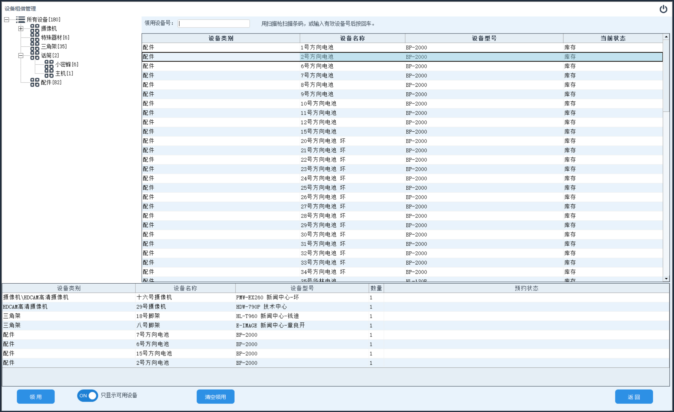 ③设备领用及归还的按钮特别大,是为了适应触摸操作模式,系统可配置触摸电脑进行自助操作。
