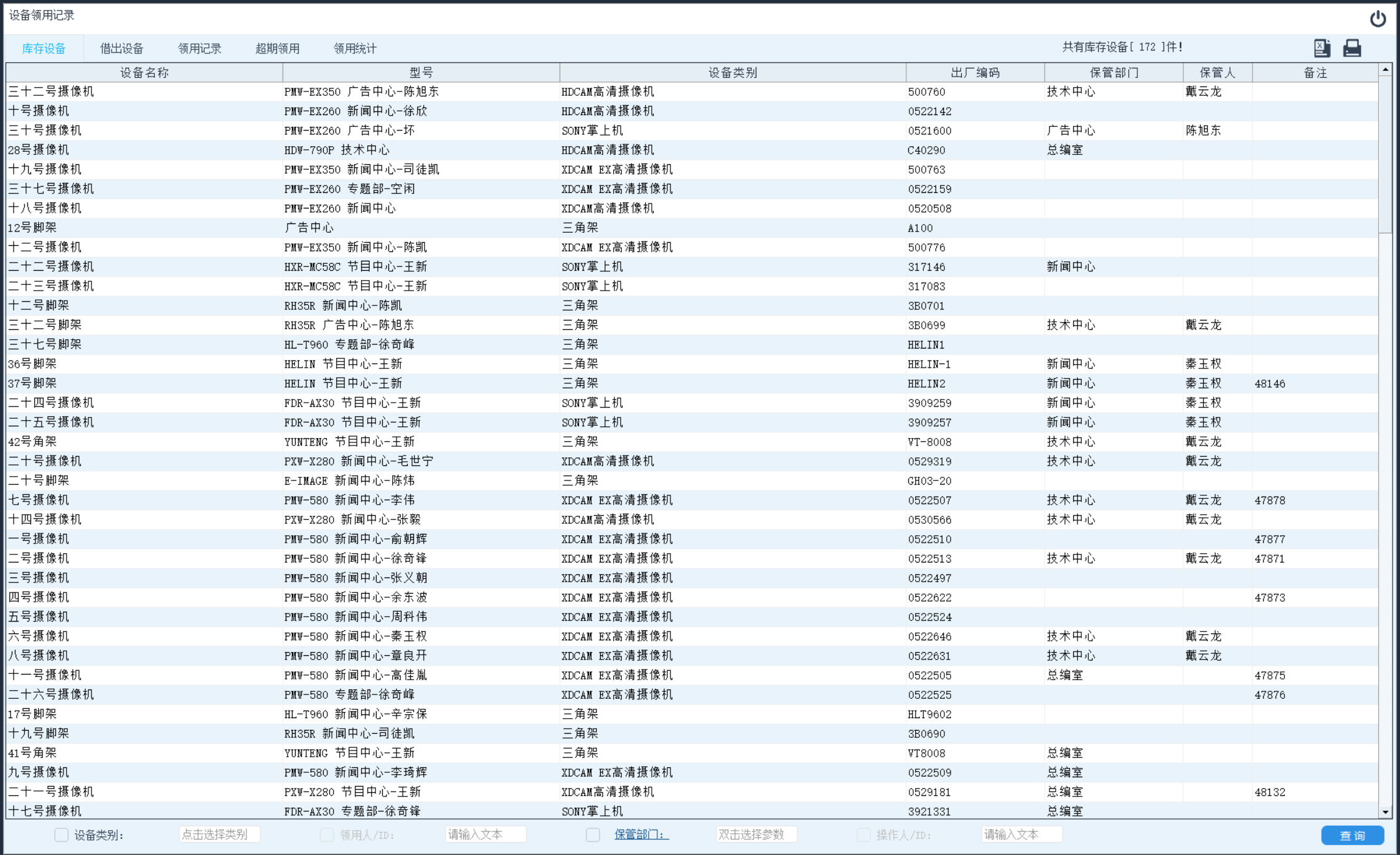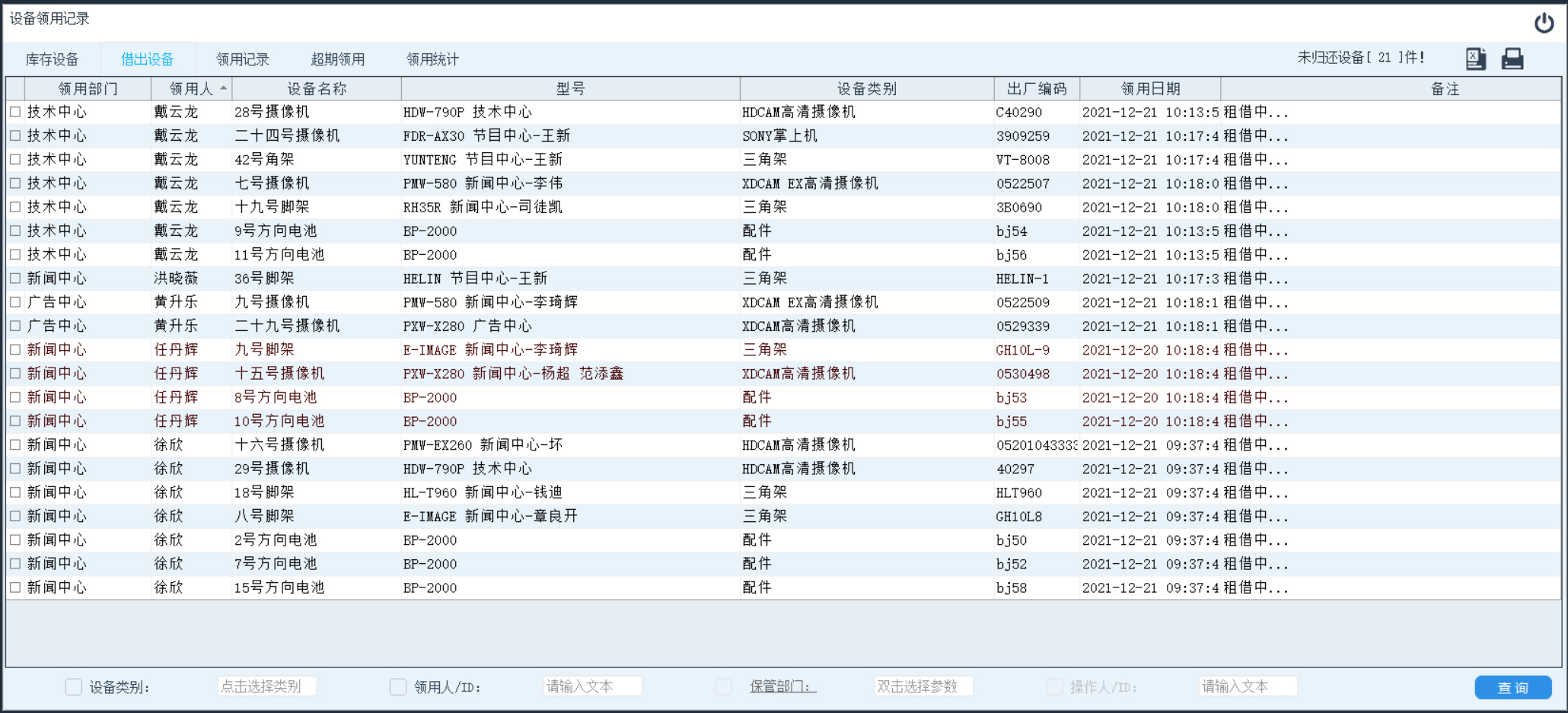 列出所有当前系统中外借未归还设备。点击左上方功能选择区域内的“借出设备”项,当此按钮变色表示选中此功能。