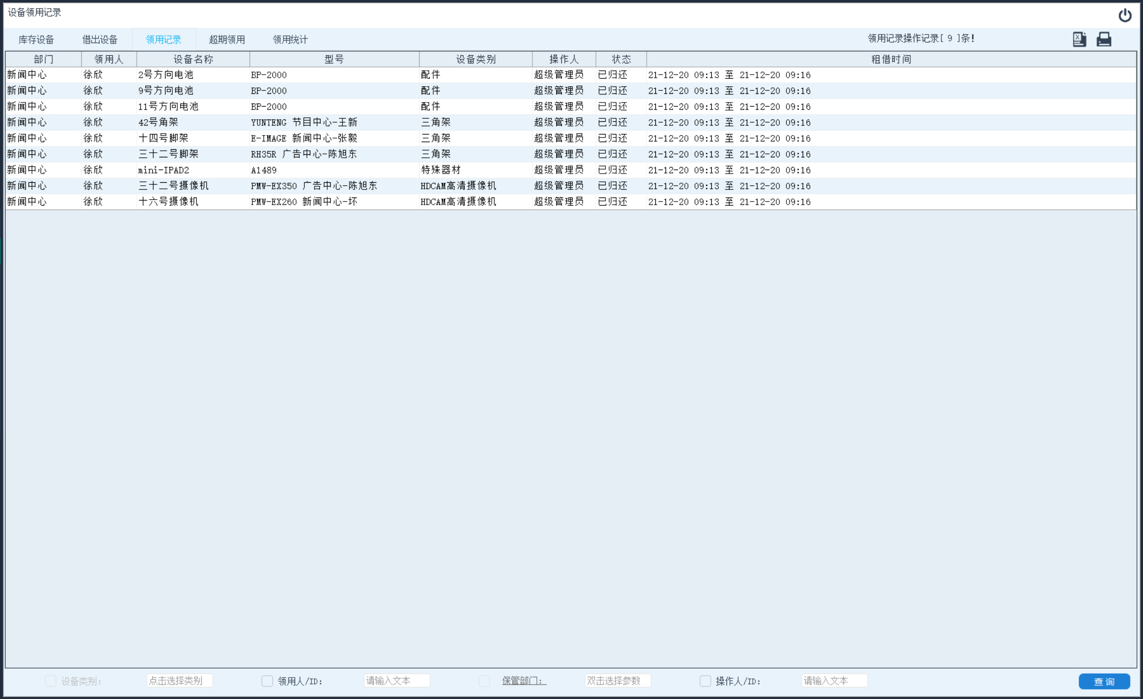 查询指定时段内设备的租借记录。点击左上方功能选择区域内的“租借记录”项,当此按钮变色表示选中此功能。