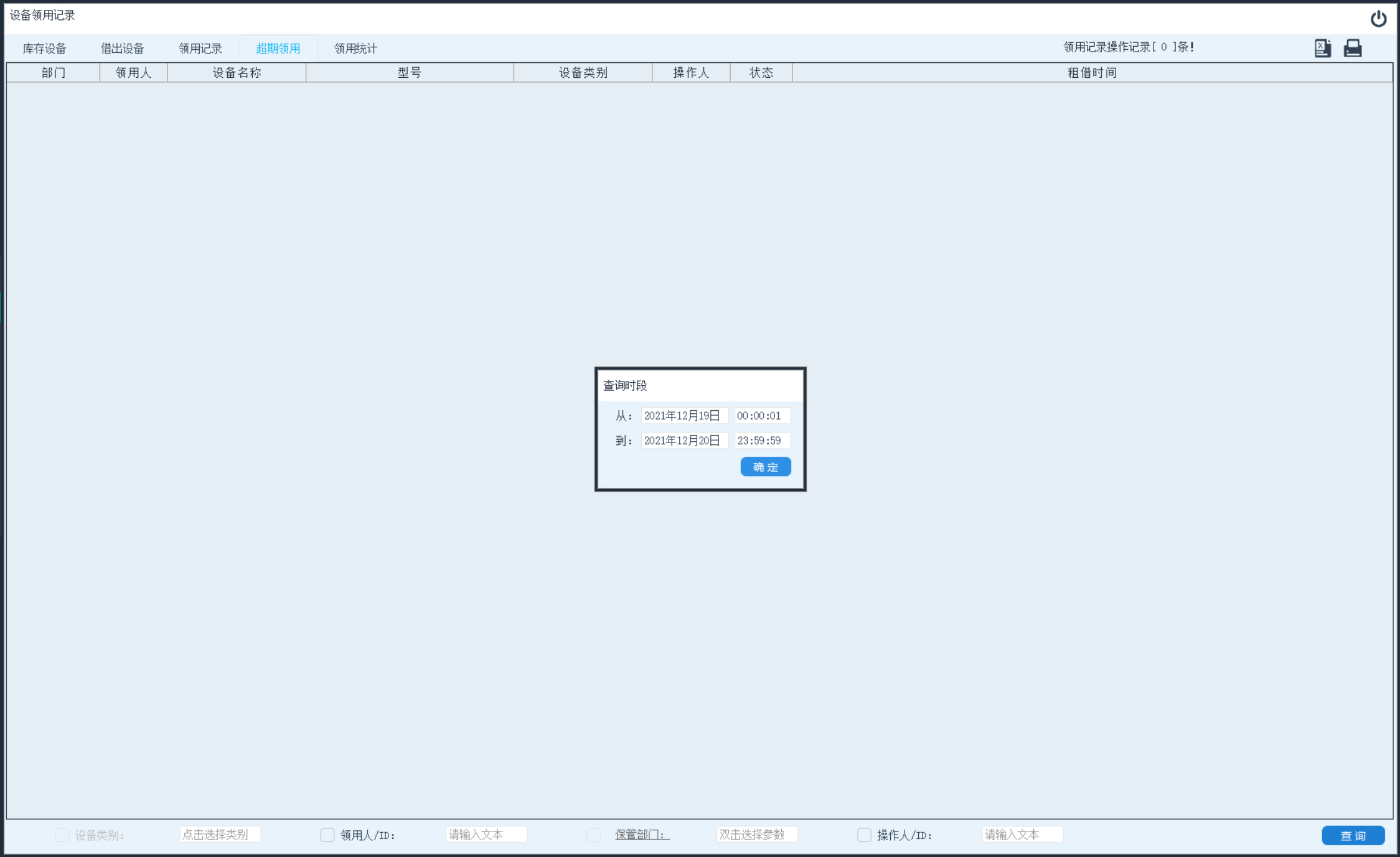 查询指定时段内超过设定期限才归还设备租借记录。点击左上方功能选择区域内的“超期记录”项,当此按钮变色表示选中。