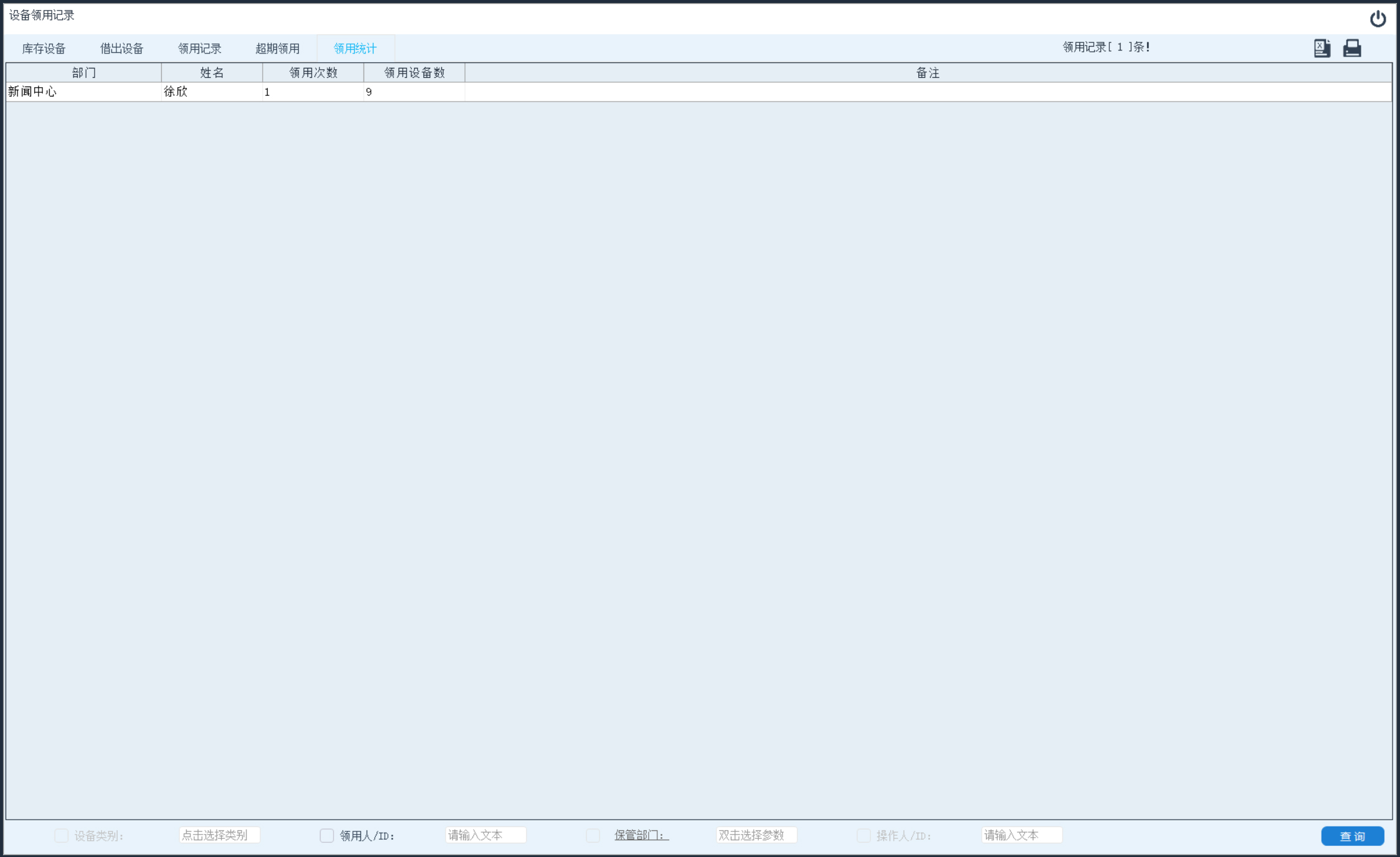 查询及统计用户在指定时段内设备的使用情况。点击左上方功能选择区域内的“领用统计”项,当此按钮变色表示选中。