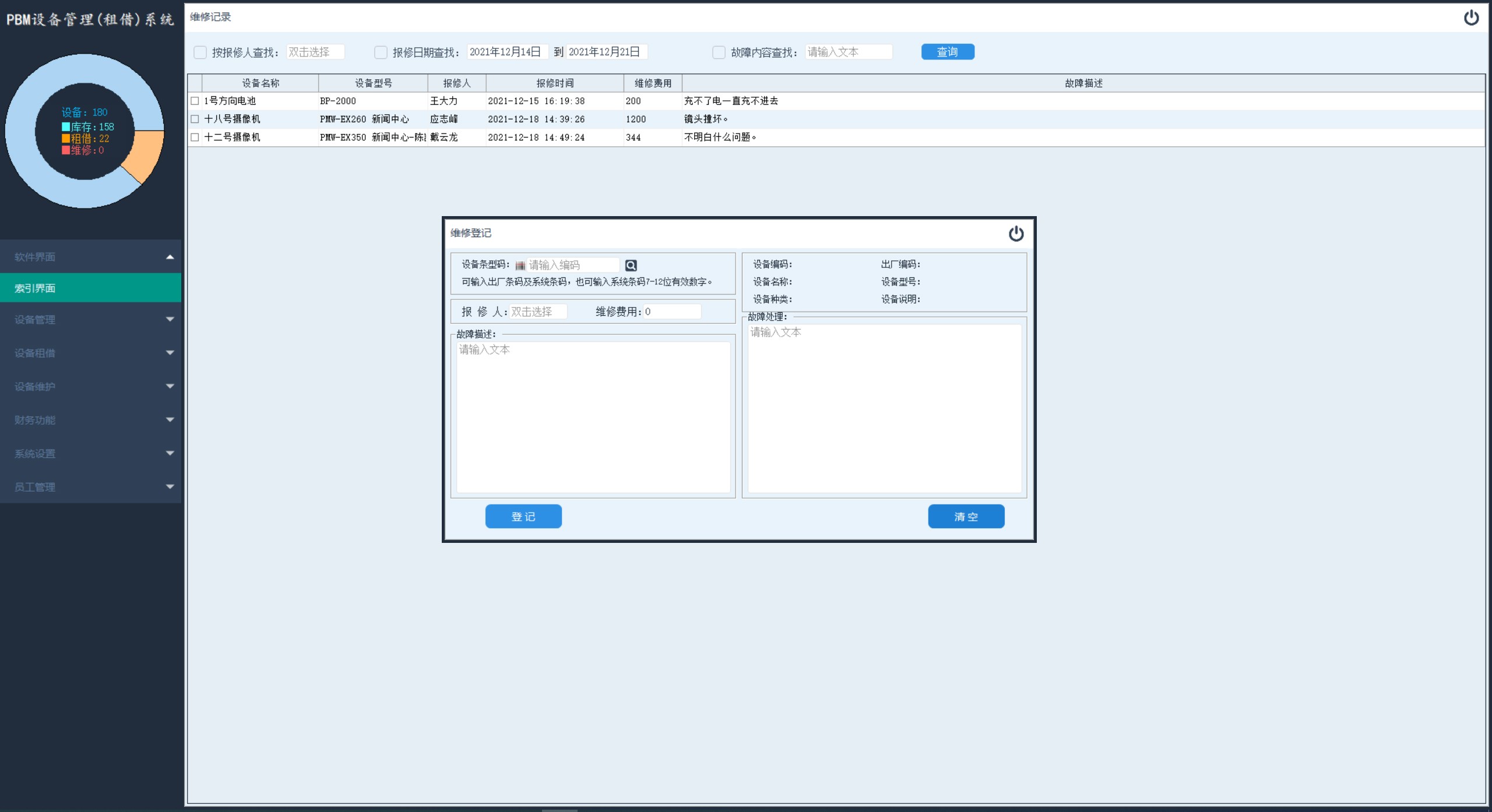 查询及管理设备维修档案。维修档案是设备档案中重要的一环,它详细记录了设备故障及处理情况。建立了完善的维修档案后管理人员可以很方便的知道设备故障率,维修成本。及部分人员设备损坏率。同时同型号设备再次出现相同故障时,也可为维修方案提供参考意见。