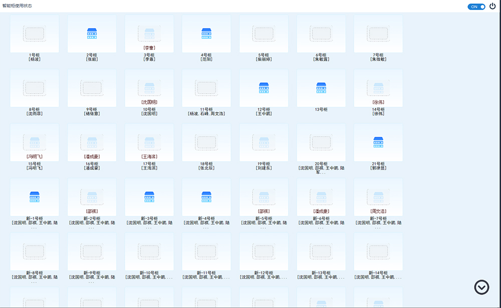 专用智能柜会在底部柜名后方显示许可用户名称。设备被领出的柜会在柜图标中间显示领出用户名称。