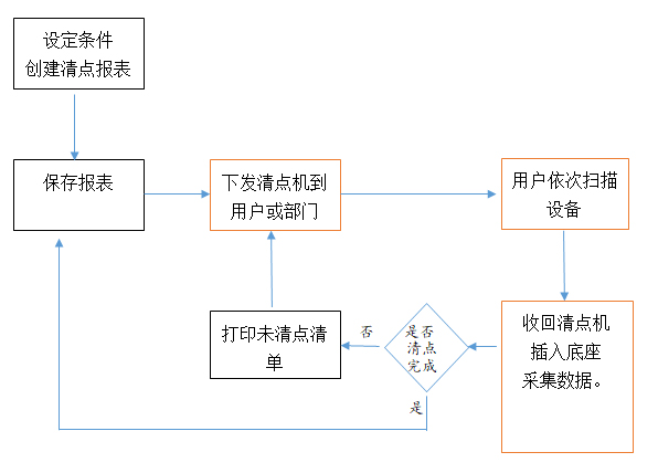 单位清点时,可将1台或多台采集器,直接下放到部门责任人,由其负责扫描设备条码,待采集完成后,打印未清点清单进行二次较正。