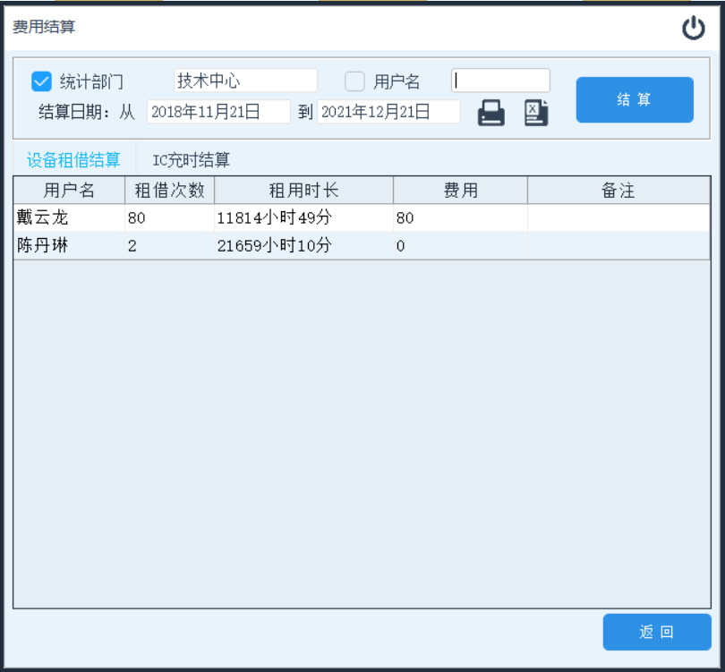 按使用时间结算用户设备租借费用,结算方式及费用在设备信息中设定。