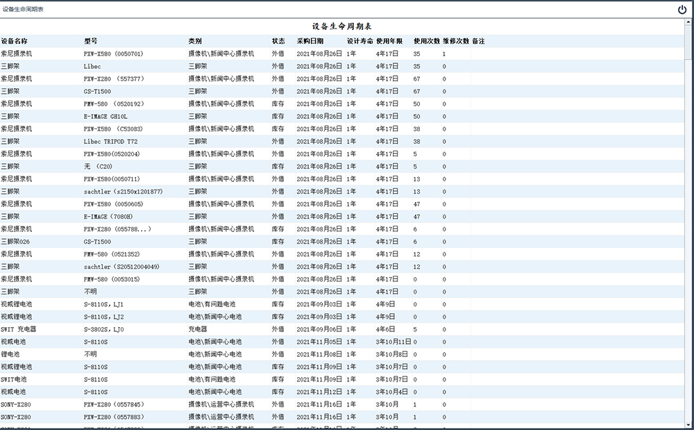 点击财务索引界面中“报废记录表”按钮,系统自动将设备的报废日志以报表的型式输出,并支持报表打印,及EXCEL文件输出。