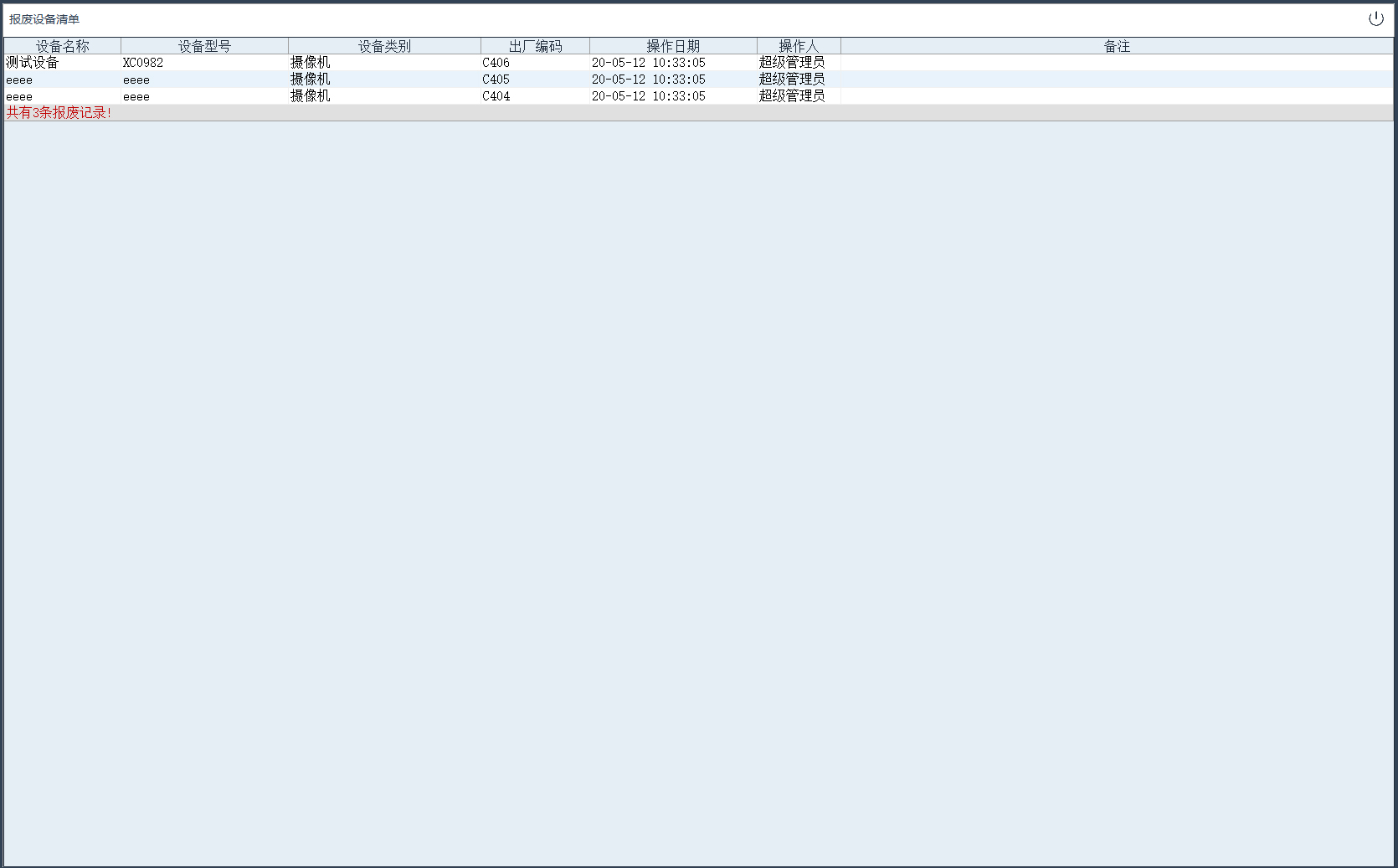 设备在进行报废操作后,所有与设备相关的记录将被清除(不包括维修记录)。系统会自动生成一条设备的报废日志,此日志记录设备基本信息。及报废时间,操作人等信息。