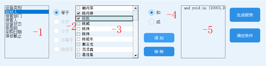 -5已选择条件:搜索条件设置好后,点击“添加”此搜索条件即生效。点击“移除”按钮则可以从条件列表中删除此规则。
