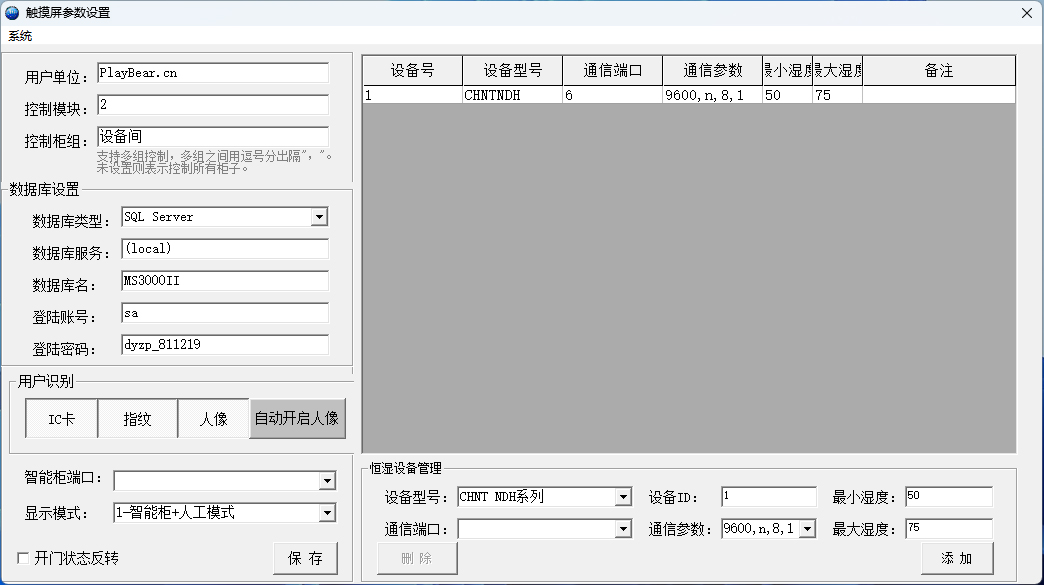 恒湿设备设置:系统支持恒湿设备管理,在此区域内添加恒湿设备,并设置好此设备通信参数及湿度范围。系统将自动与此设备通信获取智能柜的温度、湿度信息。并在湿度超出范围时开启除湿设备,并发出告警。