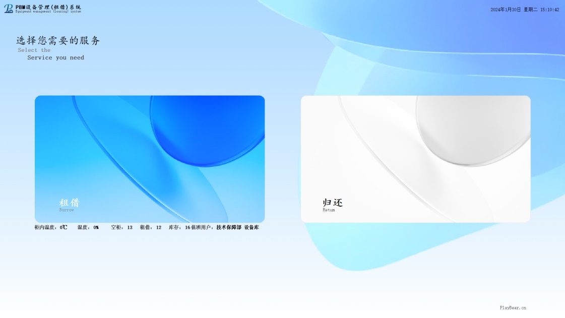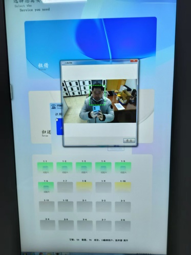 租借:点击主屏上租借按钮,识别人像或IC卡,点击打开指定柜门。