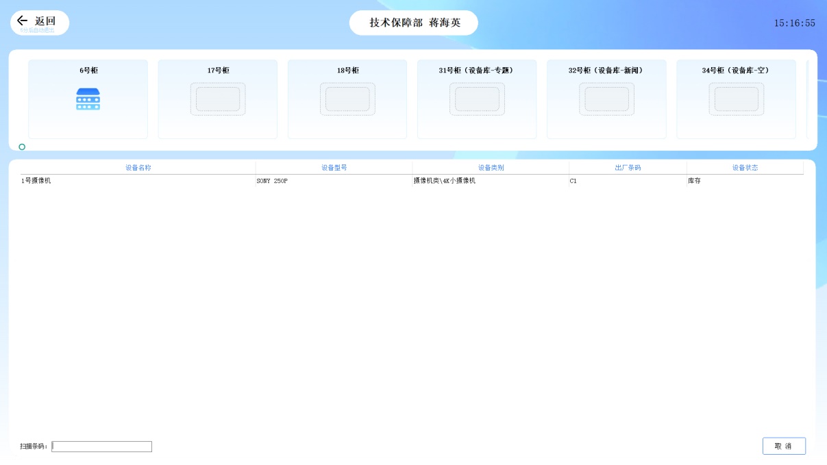 如需归还其它非柜内设备,可在此界面下直接扫描设备条形码。扫描结束即完成归还。