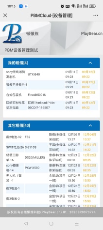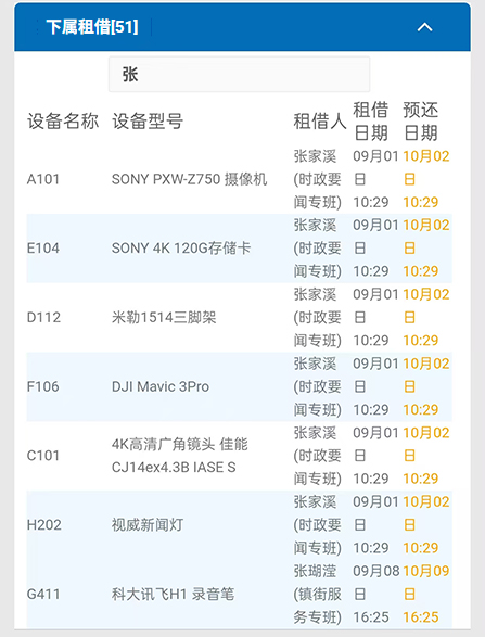 本人租借记录:展示当前用户未归还的设备列表,归还日期为黄色则为超期未归还记录,红色为已通知管理人员。