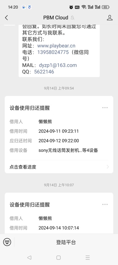 催还信息:在设定设备归还到期前发送,提醒用户及时归还设备。