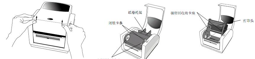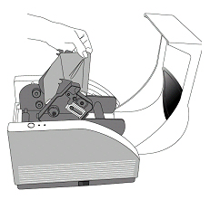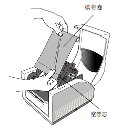 ![]() | 翻转打印头,将空管芯卡入碳带回收端。 |