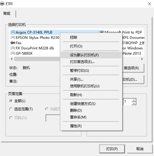 随后在打印机选择框内选中打印机名称,点击鼠标右键,并在弹出的菜单中选择“设为默认打印机”功能。