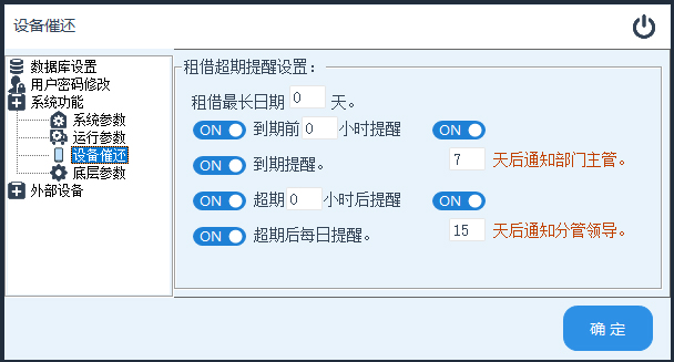 租借超期管理,此功能为管理设备使用时间。超出设定时间后系统将生成超期记录。