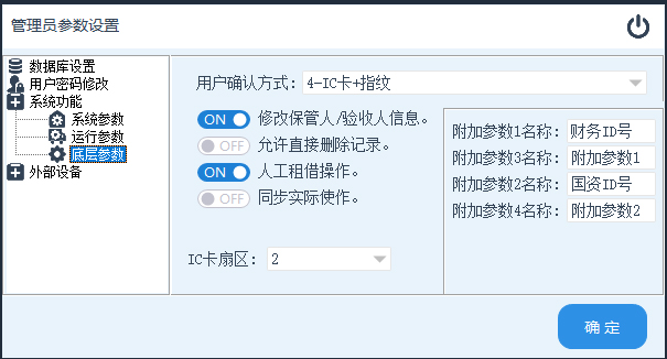 附加参数名称:系统在设计数据结构的时候保留了4个用户可自定义的文本字段,用户可按需求定制此字段名称。并保存相应的参数信息。