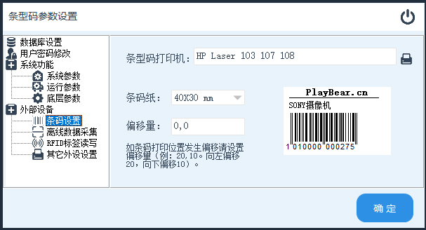 偏移量:不同厂家条码打印机由于各种原因有时打印时位置会出现偏差,此参数用于修正偏移位置。格式:右偏移量+英文逗号(,)+下偏移量,单位为像素点,15个像素点左右为1毫米。如参数“50,60”表示向右偏移50个点,像下偏移60点。