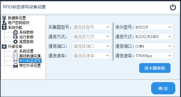 通信速率:采集器与电脑的通信速度(默认为115200,具体需要查看读写器内通信速率项)。